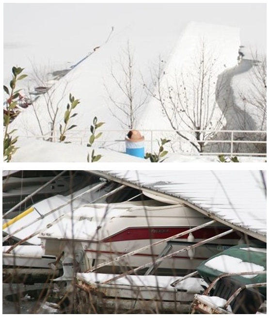 We also encounter another event one cold stormy day. The heavy snow and wind caused the roof of our dock to collapse. The boat lift we had, and one other did not sink into the water. That was good in the sense that the motor was never submerged and therefore not damaged. However, our windshield and part of the cockpit were smashed. The initial bids were astronomical.
