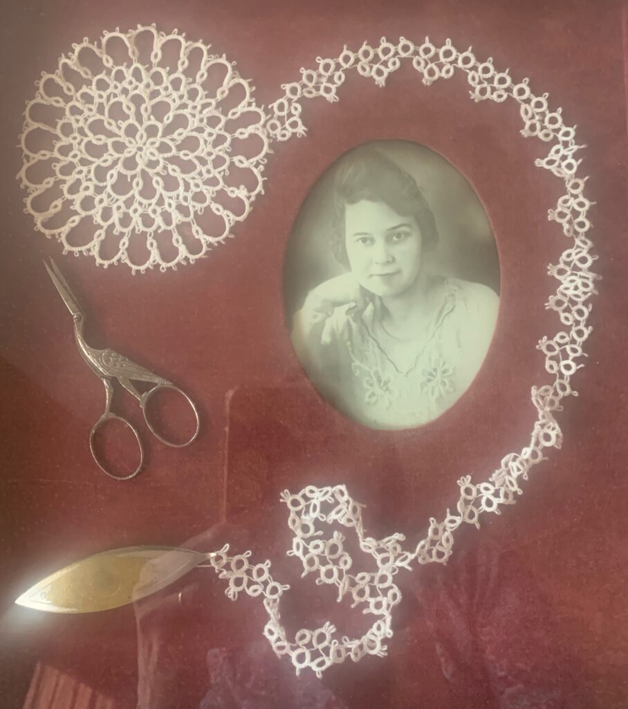 It is a very old art but the origins are unclear. It became popular in Europe and Britian in the early nineteenth century. Not nearly as popular today, it’s still a craft that is practiced. Grandma Lehr made untold yards and yards of tatting lace in her lifetime. Many of my dresses sewn by my mother were trimmed with her lace, as well as pillowcases and towels used in our home. Traditional tatting, as other needle crafts, is often passed down generation to generation. I attempted to learn the lace making skill from Grandma. However, I didn’t have much success, my knots just wouldn’t slide along the thread. I still have the tatting shuttle she gave me and someday I intend to try again. Grandma and her sisters learned as young girls. She would sit watching TV and turn our yards of beautiful lace with intricate patterns of picots, rings and joinings.