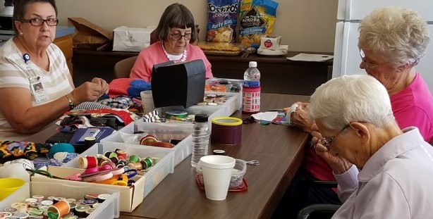 In her later years at El Dorado, Kansas. Mary sewed with the ladies’ group at St. John’s Church and the Sewing Saints at Susan B. Allen Hospital. The ladies wore pink smocks to be easily identified and made products for the gift shop with the purpose of fundraising to purchase hospital equipment. The ladies enjoyed having dinners together and visiting while sewing.