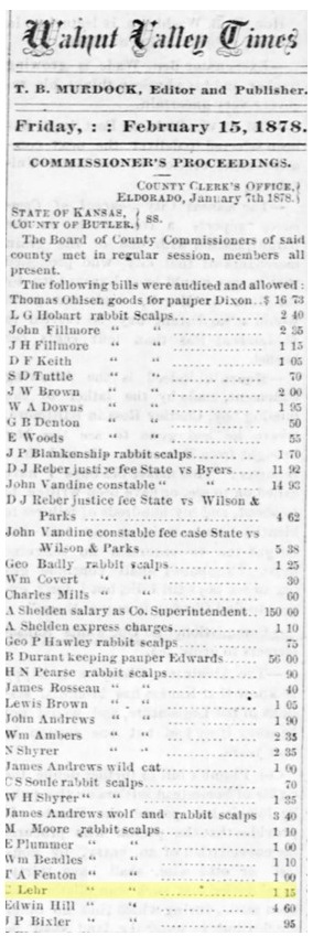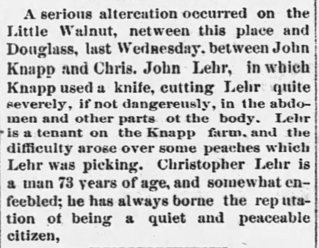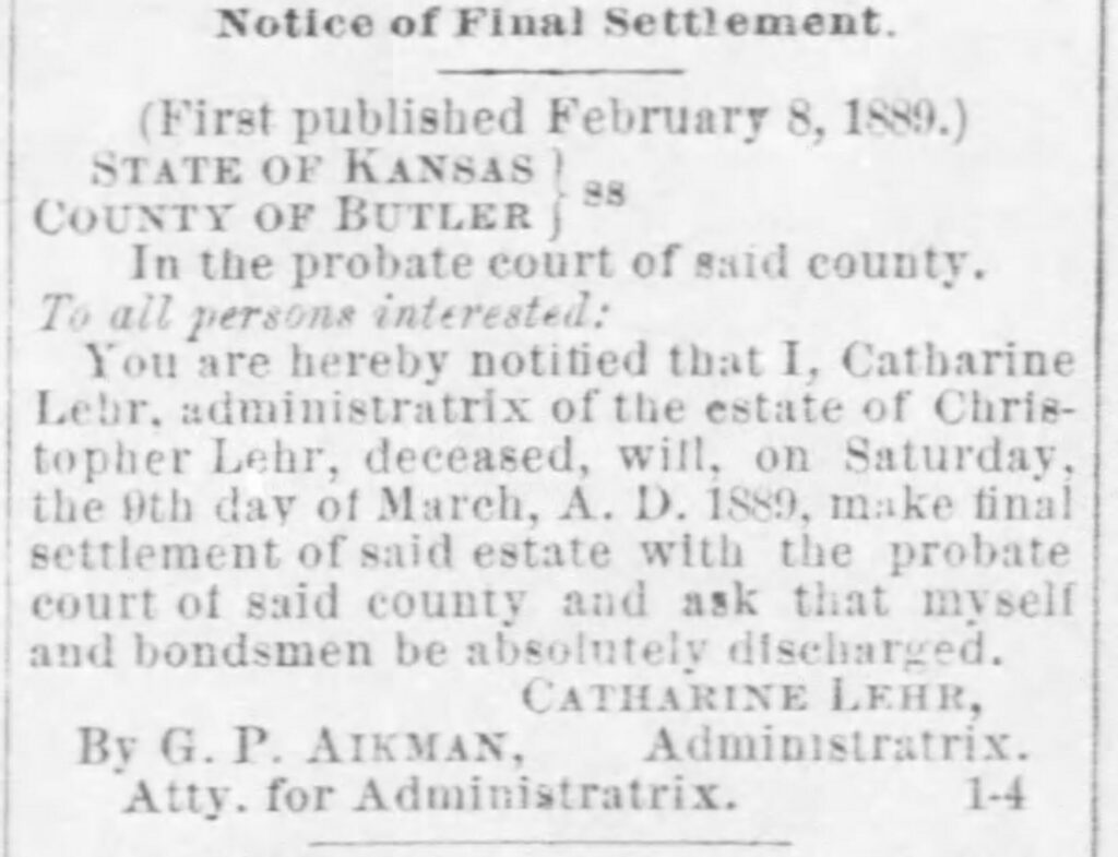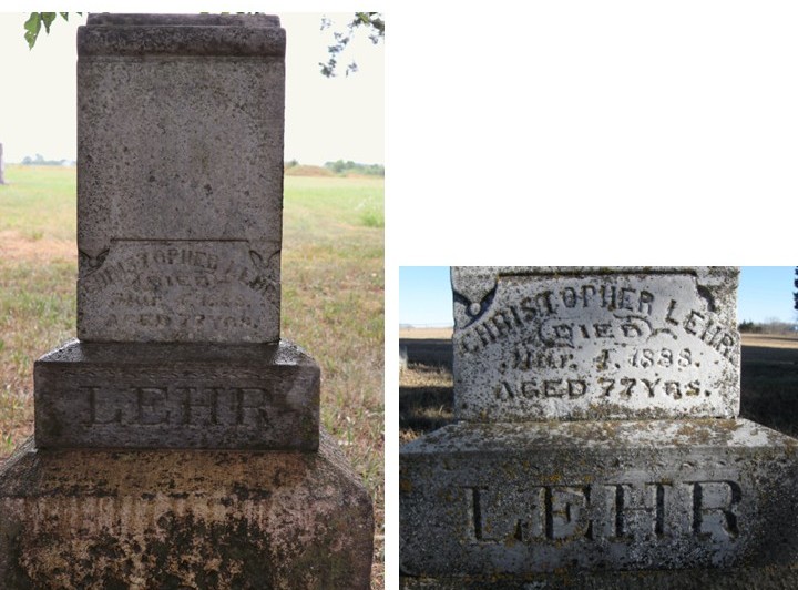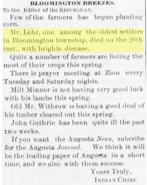 Christopher Lehr passed away on March 4, 1887 from Bright’s disease. He is buried at Fowler Cemetery, Butler County, Kansas. The cemetery is also known as Bloomington Township Cemetery and Bogle Cemetery.