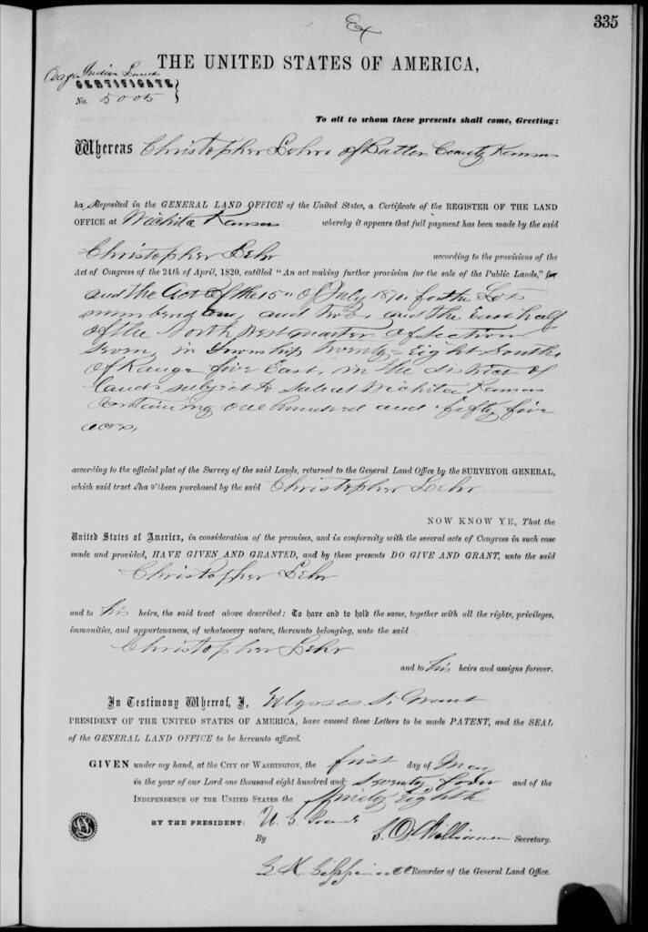 After living in Spencer County, Indiana for twenty-five years, Christopher moved to Butler County, Kansas. He and his wife, Catherine, and their blended family of six started a new life. He acquired 155 acres of land in 1874 from the US government as part of the Osage Indian Treaty and sold it in 1883. The purchase price was set at a minimum of $1.25 per acre.