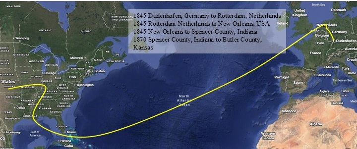 With his wife, Anna Barbara Koenig, Christopher sailed from Rotterdam, Netherlands to New Orleans, Louisiana, USA. One daughter and two sons traveled with them to the USA. The passenger ship Superb arrived on December 26, 1845. From there, they traveled to Spencer County, Indiana.